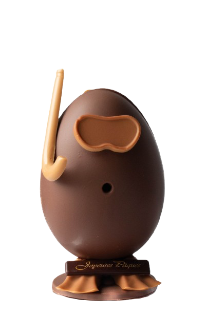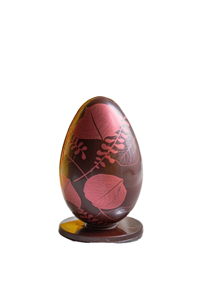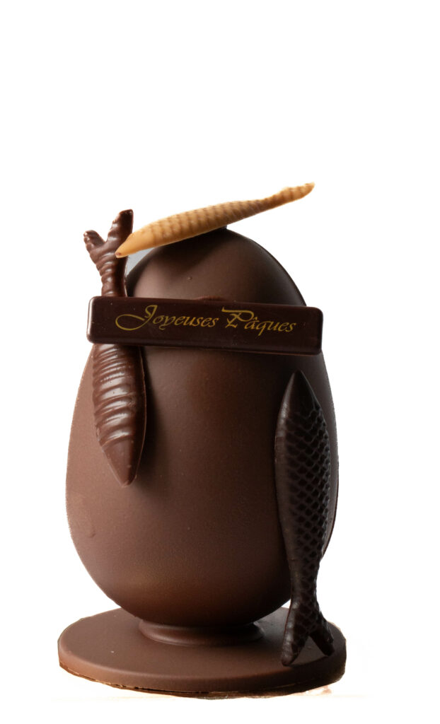 Chocolat lait ou noir, décors dulcey, garni de fritures et d’oeufs praliné